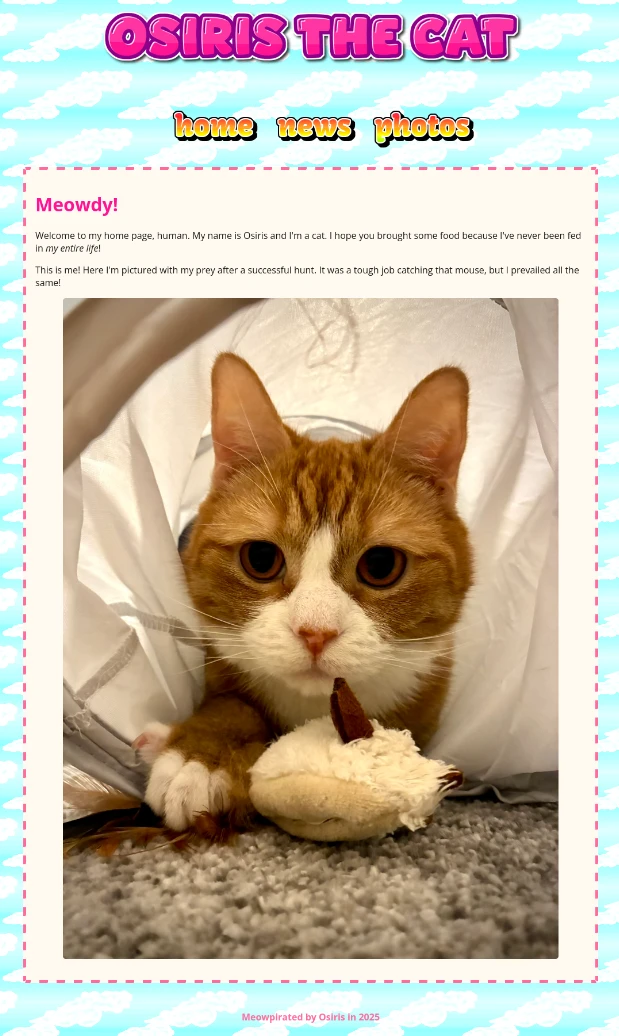 I normally don't do advertising here, whether paid or as a favor. But my cat just got a website, and I couldn't say no: meowsiris.eu